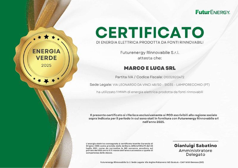 Marco e Luca Srl è orgogliosa di utilizzare energia elettrica prodotta esclusivamente da fonti rinnovabili, certificata da Futurenergy Rinnovabile S.r.l. Un impegno concreto verso un futuro più sostenibile, per noi e per le generazioni che verranno.
